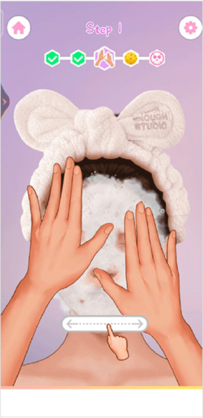 3、按顶部指引完成面部清洁步骤,拖动指示条揉搓出泡沫清洁面部;