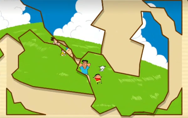 4、动画结束后,蜡笔小新即可开始拼图,点击拼图碎片移动到合适位置即可;