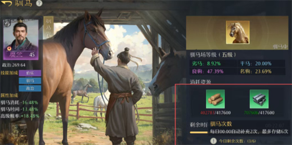 2.任命具有高魅力或特定驯马加成的武将担任驯马官,官职属性越高,获得稀有词条与金色马匹的机会就越大。