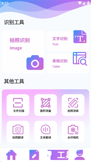 4、包含了很多实用工具,支持拍照识别、文字识别、表格识别等,还有文件扫描和面积测量等工具。
