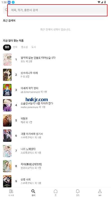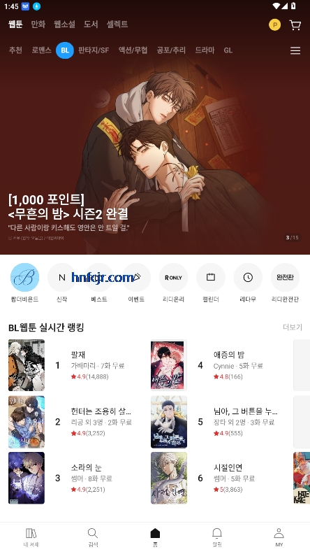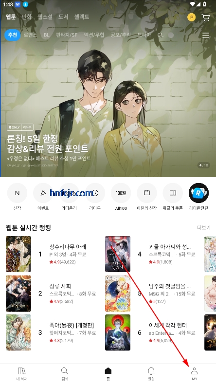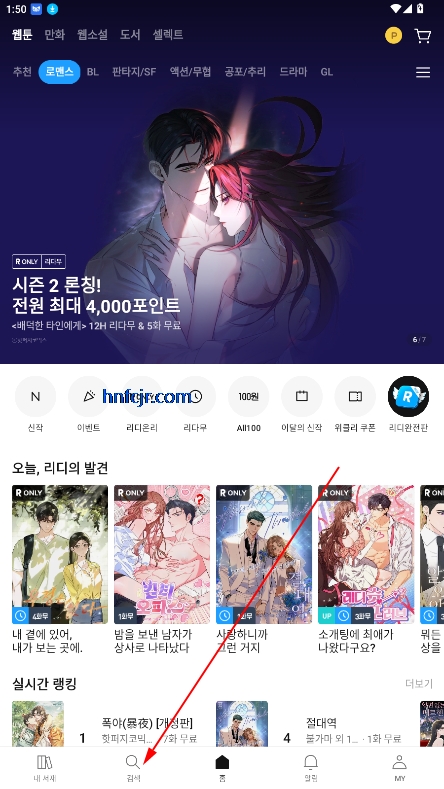 1、打开Ridibooks,从首页上方的分类栏中,挑选感兴趣的韩漫类型;
