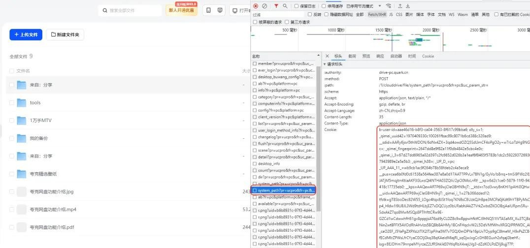 2、获取目标网盘的Cookie:打开浏览器开发者工具,选中右侧“网络”标签,刷新网盘页面,找到以 “system_path?pr=ucpro”开头的相关项,查看右侧信息中的Cookie字段,复制完整内容后,填入OpenList的Cookie表单;