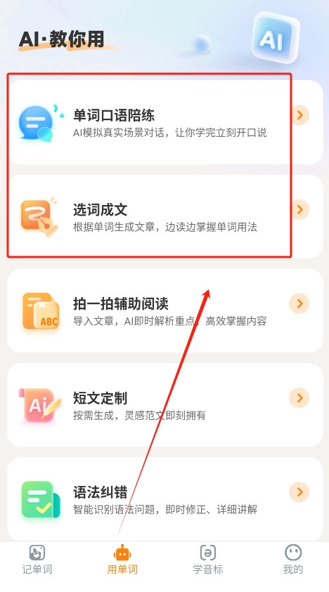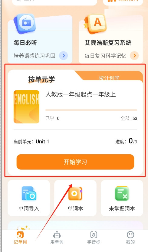 2、然后,用户可以根据自身的学习目标选择不同的功能模块,例如单词复习和发音训练,逐步掌握更多词汇。